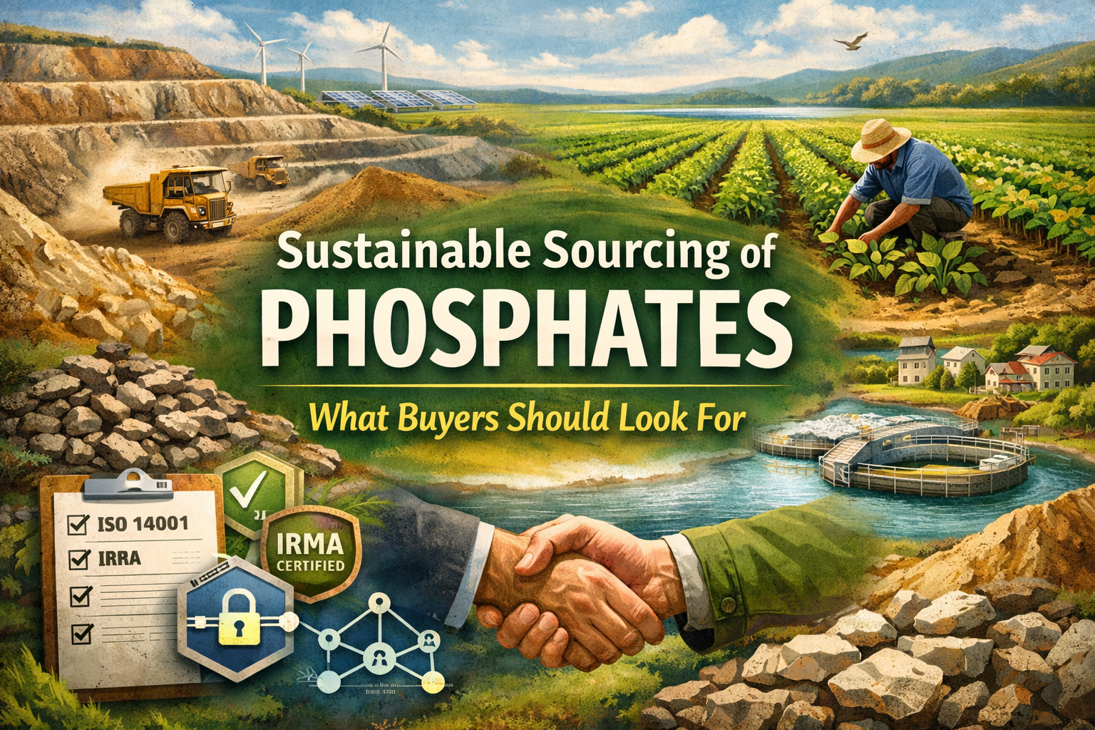 Global demand for phosphates continues to rise, driven by agricultural intensification, food production, animal nutrition, water treatment, and pharmaceutical applications. Phosphates are essential for crop yields, food preservation, detergents, and a wide range of industrial processes. Yet behind this essential mineral lies a complex supply chain shaped by environmental pressures, geopolitical concentration, and increasing regulatory scrutiny. Phosphate rock reserves are geographically concentrated, while the extraction and processing of this resource can generate significant environmental impacts. Land disturbance, water use, waste generation, and carbon emissions are now under close examination from regulators, investors, and customers alike. At the same time, ESG reporting standards and green procurement policies are transforming how procurement teams evaluate suppliers. Sustainable phosphate sourcing is no longer a niche consideration - it is becoming a strategic priority. Buyers across the agricultural, food, pharmaceutical, and industrial sectors must now assess not only price and quality, but also environmental compliance, responsible mining practices, carbon intensity, and traceability. This article outlines what procurement managers and sustainability officers should evaluate when building a responsible, future-ready phosphate supply chain. Why Sustainable Phosphate Sourcing Matters Environmental Impact of Phosphate Mining Phosphate mining impact can be substantial if not carefully managed. Extraction of phosphate rock often involves open-pit mining, which may lead to land degradation and habitat loss. Sensitive ecosystems can be disrupted, and rehabilitation can take years if not properly planned. Water contamination is another concern. Improper handling of waste rock or tailings may introduce phosphorus or associated elements into nearby water systems , contributing to eutrophication, excessive nutrient enrichment that harms aquatic life. Processing activities also require significant water use, increasing pressure in water-scarce regions. Carbon emissions from extraction, beneficiation, and chemical processing contribute to the overall carbon footprint of fertilizers and industrial phosphates . As climate reporting expands, buyers are increasingly responsible for understanding the upstream emissions embedded in their raw materials. Regulatory & ESG Pressures on Buyers Sustainable phosphate sourcing is increasingly driven by ESG compliance obligations. Many organizations must report Scope 3 emissions – indirect emissions from purchased goods and services. Phosphates, particularly in fertilizer production , can represent a meaningful portion of this footprint. Global environmental compliance standards are tightening. Regulations on mining rehabilitation, water discharge, and waste management are becoming more stringent across jurisdictions. Investors are also demanding transparency around responsible mineral sourcing and ethical supply chains. Procurement teams are therefore not just sourcing a mineral - they are managing regulatory exposure, reputational risk, and long-term sustainability commitments. Key Sustainability Criteria Buyers Should Evaluate Responsible Mining Certifications Certifications provide an initial signal of commitment to phosphate ESG standards. Buyers should look for suppliers with ISO 14001 certification, demonstrating structured environmental management systems. Participation in frameworks such as the Initiative for Responsible Mining Assurance (IRMA) or alignment with the Responsible Minerals Initiative (RMI) can further indicate adherence to responsible mining practices, social responsibility, and transparent governance. While certification alone is not proof of sustainability, it provides a structured baseline for evaluating responsible phosphate suppliers. Environmental Management Practices Beyond certificates, buyers must assess practical environmental management. Water stewardship programs are critical, particularly in arid regions. Suppliers should demonstrate water recycling systems, reduced freshwater withdrawal, and responsible discharge management. Waste management systems must address phosphogypsum stacks and tailings storage safety. Robust tailings management plans, emergency response strategies, and independent safety audits are essential to minimize environmental risk. Land rehabilitation commitments are another indicator of sustainable fertilizer production. Responsible operators progressively restore mined land, reintroduce vegetation, and monitor ecological recovery. Mining rehabilitation plans should be transparent, funded, and measurable. Environmental compliance documentation should be readily available and regularly updated. Carbon Footprint & Energy Efficiency Low-carbon phosphate production is becoming a competitive differentiator. Buyers should request carbon intensity data per metric ton of product and assess whether renewable energy is used in mining or processing operations. Energy-efficient beneficiation technologies, electrified equipment, and carbon-neutral mining initiatives can significantly reduce emissions. Transparency in reporting, aligned with recognized ESG reporting standards, helps buyers integrate data into their own sustainability disclosures. Suppliers unwilling to share emissions data may present future compliance risks. Ethical Labor & Community Engagement Ethical phosphate sourcing extends beyond environmental factors. Suppliers should adhere to fair labor standards, prohibit forced or child labor, and ensure safe working conditions. Community development investments, such as local employment, infrastructure support, and stakeholder engagement, indicate long-term social responsibility. Transparent supply chains and open communication strengthen buyer confidence and reduce reputational risk.