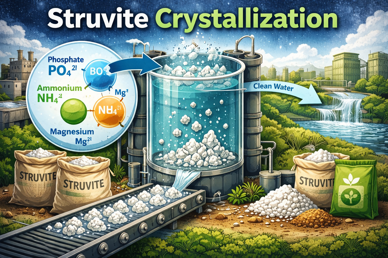 Struvite (magnesium ammonium phosphate, MgNH₄PO₄·6H₂O) is perhaps the most commercially mature recovery pathway. When magnesium is added to phosphate and ammonia-rich wastewater under controlled pH conditions, struvite precipitates as compact, slow-release crystals. These crystals are a recognized fertilizer product, sold commercially under brand names such as Crystal Green by Ostara. Struvite crystallization is now deployed at scale in wastewater treatment plants across North America and Europe, and industrial operators are increasingly adapting reactor designs to their specific effluent chemistries.